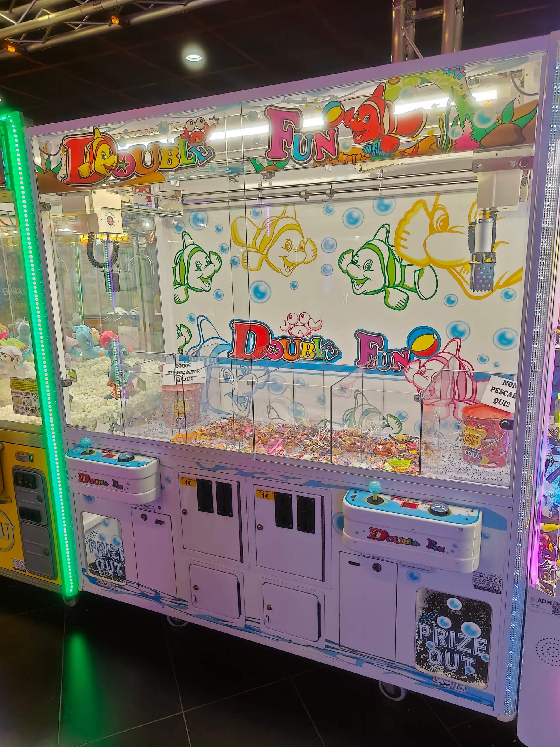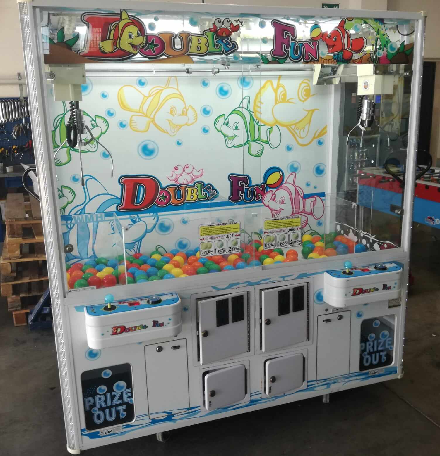 Double Fun, prodotta da Paokai Electronic nel 2012 a Taiwan, è un apparecchio a premio della tipologia crane machine, nello specifico è una gru pesca peluche. Presenta un cabinato ampio e robusto con doppia postazione di gioco. Il design colorato e luminoso, arricchito da luci a LED, rende l’apparecchio attraente e facilmente riconoscibile in sala giochi. Il gameplay è immediato: precisione, tempismo e abilità sono essenziali per afferrare i premi. L’esperienza risulta coinvolgente e stimolante, ideale sia per il pubblico adulto sia per i giocatori più piccoli. Disponibile in 3 versioni: benne grandi per palloni misura 5, benne standard per peluche misura 3 o benne piccole per caramelle.