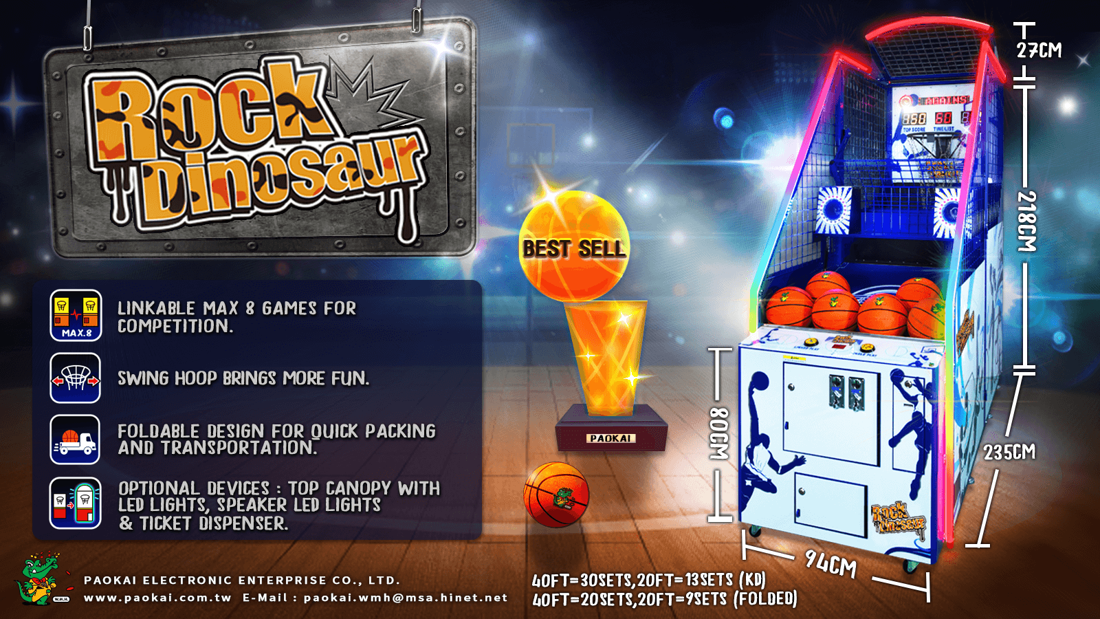 Rock Dinosaur All Stars è un apparecchio arcade di tipologia basketball prodotto da Paokai Electronic a Taiwan nel 2014. È progettato per un giocatore, con possibilità giocare in modalità singolo oppure in link multiplayer con altre unità. Il cabinato presenta una solida struttura grigliata di colore blu, arricchito da illuminazione a LED e grafiche a tema sportivo che lo rendono immediatamente riconoscibile e molto apprezzato dai fan dei giochi da basket. Il canestro dinamico aumenta la sfida, rendendo la partita più difficile man mano che si avanza con le fasi di gioco. Il gameplay è rapido e intuitivo: basta centrare il canestro e segnare più punti possibili entro il limite di tempo. Un’esperienza divertente, competitiva e ideale per sale giochi e family entertainment centers.