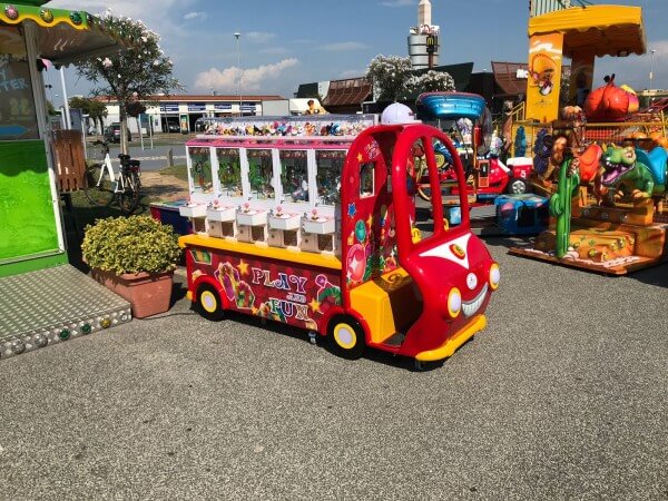 Q Car è un apparecchio arcade a premio appartenente alla categoria delle crane machines/claw machines, nello specifico è una gru pesca peluche. Prodotta a Taiwan nel 2017 da Paokai Electronic, è stata progettata specificamente per premi di piccole dimensioni. A differenza delle claw tradizionali presenta un cabinato multi-postazione a forma di “bus” che ospita 10 mini-gru totalmente indipendenti fra loro, permettendo quindi a dieci giocatori di giocare simultaneamente. In aggiunta nella parte frontale è presente una doppia seduta fissa pensata per i bambini, che possono accomodarsi e giocare in compagnia, pur senza comandi attivi. Il top display funge da vetrina per esporre i premi disponibili e attira subito l’attenzione grazie all’illuminazione a LED. Il gameplay è vivace e molto immediato: ritmo rapido, controllo semplice della benna tramite joystick e pulsante, forte appeal per bambini e famiglie, ottimo quindi per sale giochi, luna park e family entertainment centers ad alto afflusso. Disponibile in versione unica con benne molto piccole per caramelle, peluche portachiavi o piccoli gadget.