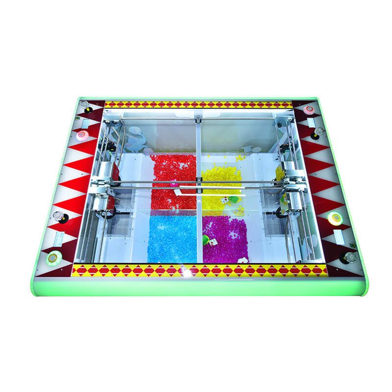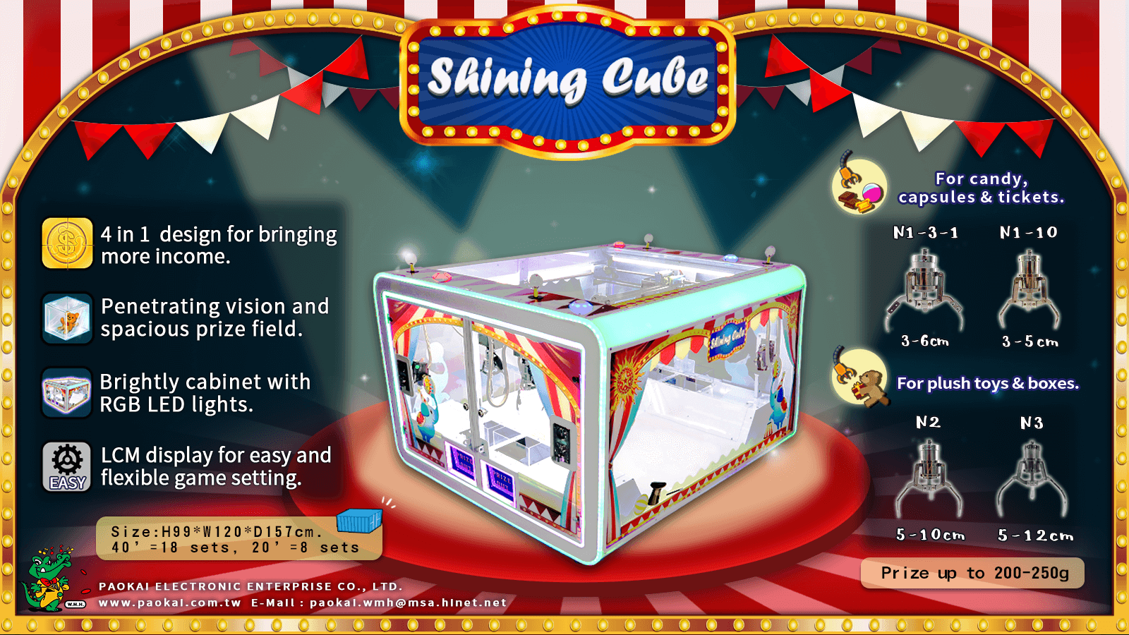 Shining Cube è un apparecchio a premi prodotto da Paokai Electronic, azienda taiwanese specializzata in crane machines di alta qualità. Introdotta nel 2024, appartiene alla categoria delle crane machines/claw machines, nello specifico è una gru pesca peluche. Si distingue per la sua particolare struttura a quattro postazioni di gioco indipendenti, che consentono a fino a quattro giocatori di partecipare simultaneamente, ognuno con il proprio set di comandi. Il cabinato, caratterizzato da una forma cubica moderna e da una ricca illuminazione LED multicolor, è stato progettato per offrire un impatto visivo di grande effetto, ideale per attirare l’attenzione in qualsiasi contesto d’intrattenimento. Ogni sezione di gioco è autonoma, con un proprio piano di gioco e una benna dedicata, permettendo ai giocatori di vivere l’esperienza della classica gru in un formato condiviso e divertente. Il gameplay segue le dinamiche tradizionali delle claw machines: i giocatori utilizzano il joystick per muovere la benna e tentare di afferrare il premio desiderato. L’esperienza risulta semplice ma appagante, richiedendo una buona dose di abilità e tempismo. Le luci dinamiche e le melodie di accompagnamento contribuiscono a creare un’atmosfera vivace e piacevole, rendendo Shining Cube una macchina ideale per sale giochi, centri commerciali e family entertainment centers. Nel complesso, Shining Cube unisce design molto moderno, funzionalità multi-giocatore e dimensioni compatte, offrendo un’esperienza coinvolgente e perfetta per location moderne e luminose. Disponibile in versione unica con benna piccola per peluche misura 1-2.
